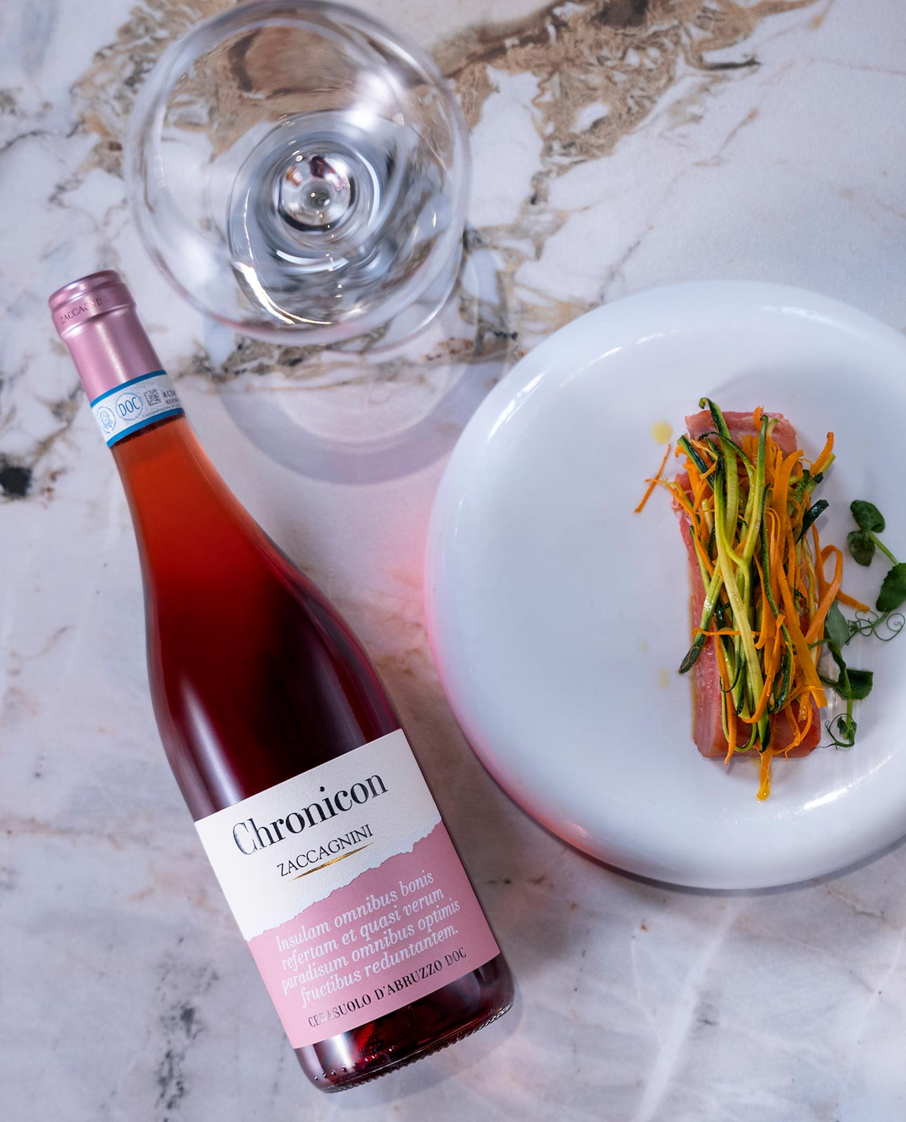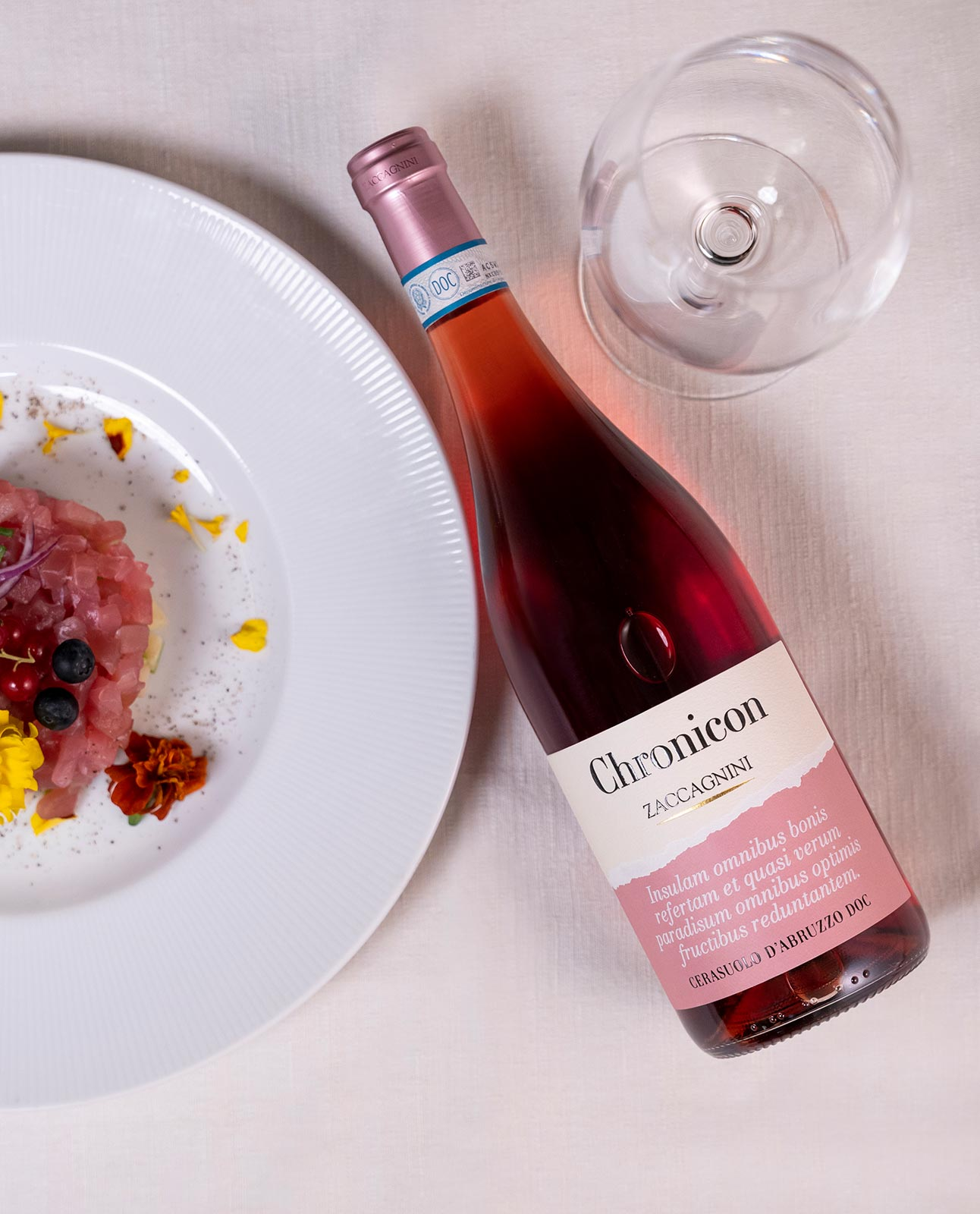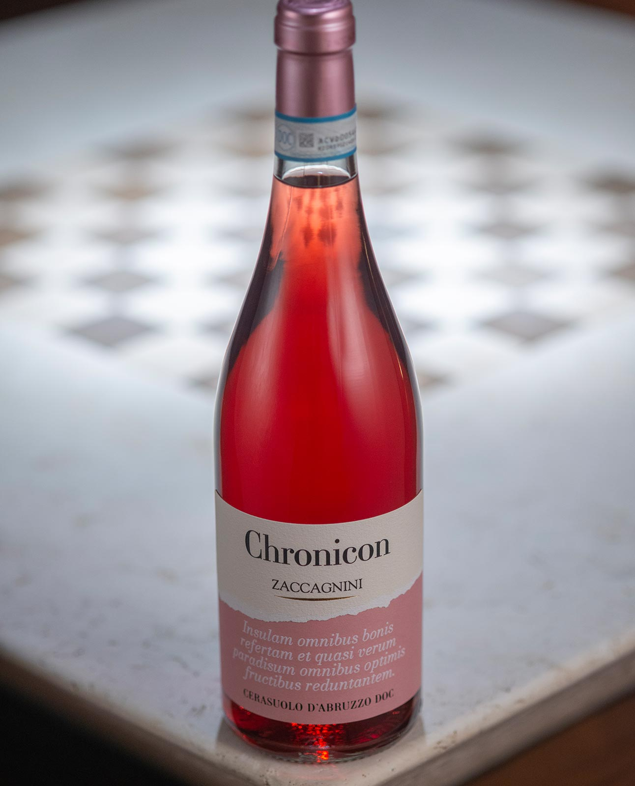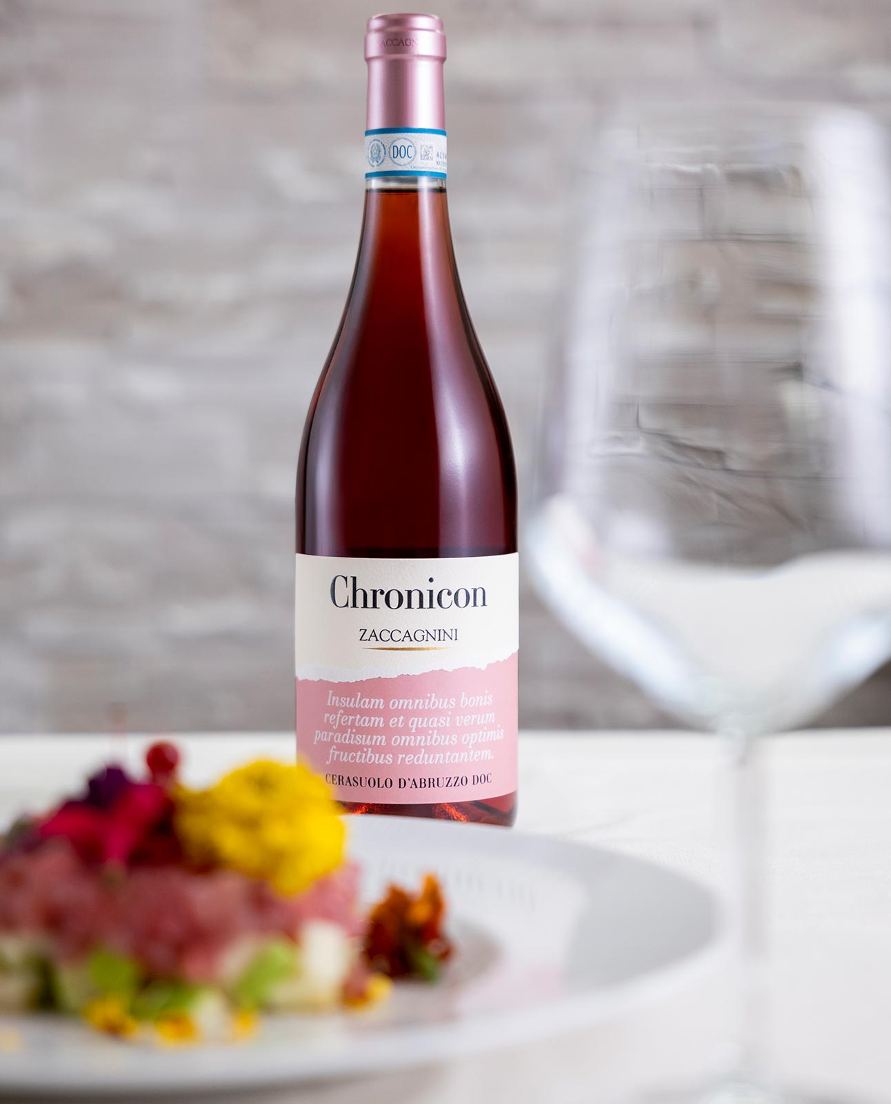 Chronicon Cerasuolo d’Abruzzo DOC è un rosato di carattere che nasce nella Valle Casauria, in Abruzzo, da uve Montepulciano d’Abruzzo coltivate su terreni argillosi di medio impasto con esposizione ovest. La costante ventilazione e le escursioni termiche favoriscono una maturazione ideale delle uve, raccolte a fine settembre. Dopo la diraspa-pigiatura, una pressatura soffice sottovuoto estrae il pregiato mosto fiore, che fa stabulazione a freddo per 10 giorni e affina poi sui lieviti in vasche di acciaio inox fino all’imbottigliamento.