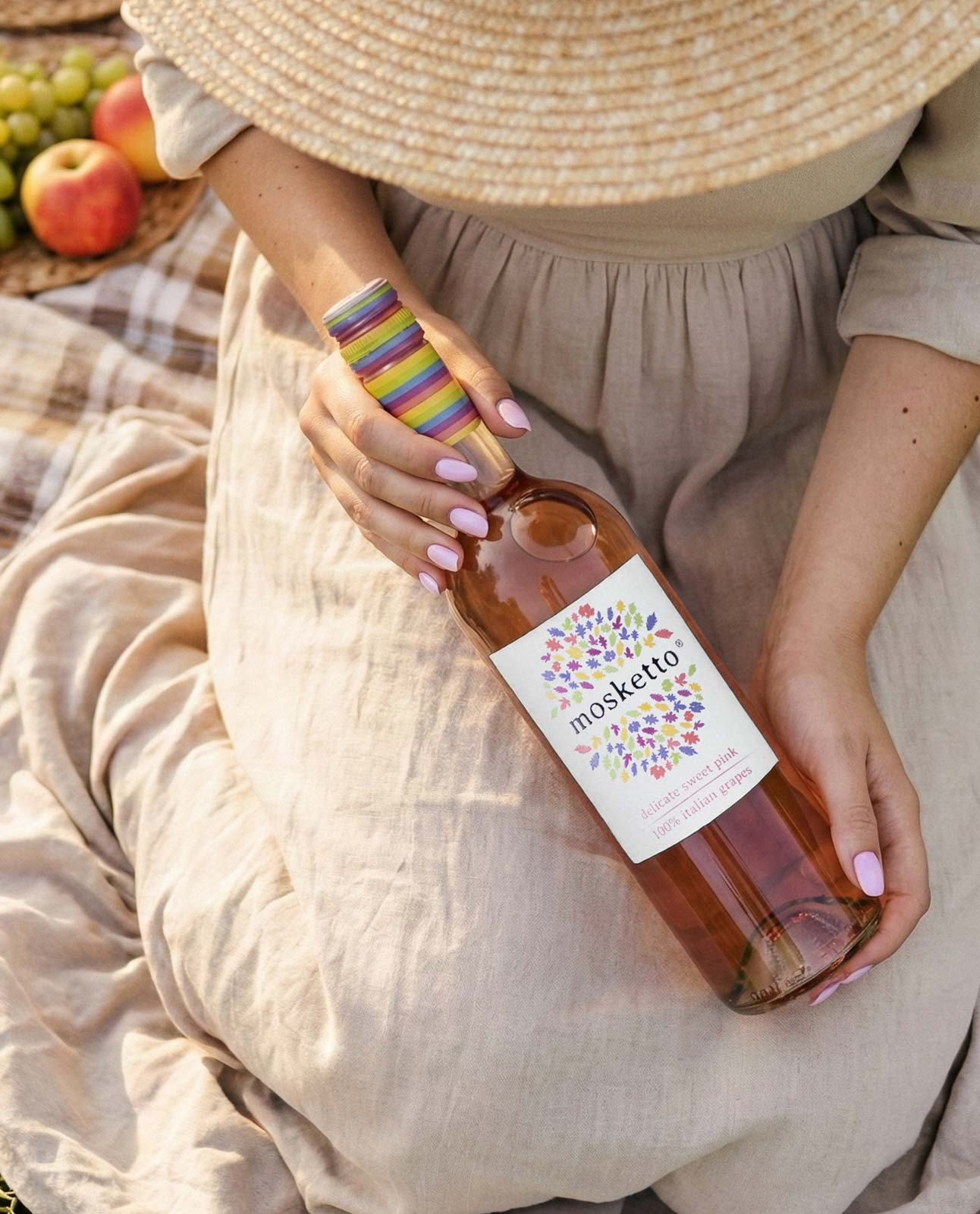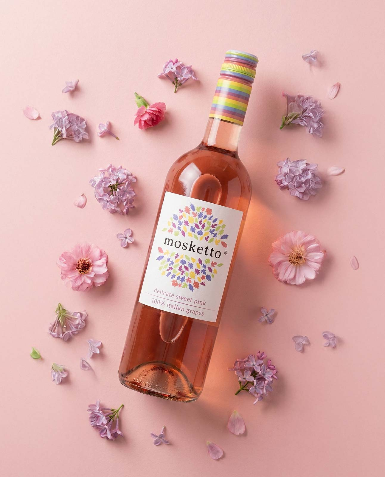 Mosketto nasce dall’essenza di fragranti varietà italiane: bollicine naturali, bassa gradazione alcolica e un’esplosione di freschezza in ogni sorso. Colorato, genuino e versatile, è perfetto da gustare da solo o come base per cocktail invitanti.